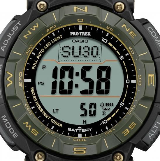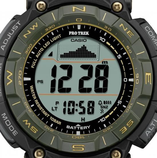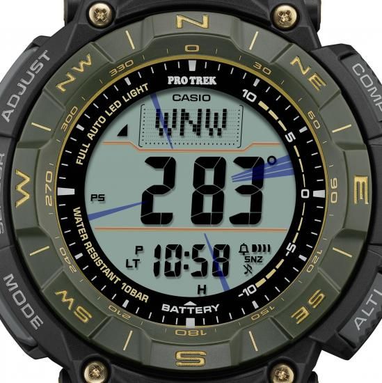 | 特徴 | ワールドタイム:世界48都市(31タイムゾーン、サマータイム設定機能付き)+UTC(協定世界時)の時刻表示 日の出・日の入時刻表示 ストップウオッチ(1/10秒、1,000時間計、スプリット付き) タイマー(セット単位:1分、最大セット:24時間、1秒単位で計測) 時刻アラーム5本(1本のみスヌーズ機能付き)・時報 フルオートカレンダー 高度計測機能/相対高度計(計測範囲:−700 〜 10,000m)、高度メモリー(計測月日・時刻・高度を最大30本マニュアルメモリー、自動記録データ:最高/最低高度、オート積算(上昇/ 下降)メモリー)、登山記録データ14本(最高/最低高度、オート積算(上昇/下降)メモリー)、高度差計測(−3,000〜3,000m)、計測間隔設定機能(5秒/2分毎)※最初の3分間のみ1秒毎 気圧計測機能(計測範囲:260〜1,100hPa)、気圧傾向グラフ表示(過去42時間分を表示)、気圧差グラフィック、気圧傾向インフォメーションアラーム(特徴的な気圧の変化が起こった場合に矢印と報音でお知らせします) 方位計測機能:16方位・方位の角度(0 〜359°)を計測、方位連続計測(60秒)、東西南北をグラフィック表示、ベアリングメモリー(方位の角度、記録した方向を示すグラフィックを1本メモリー)、磁気偏角補正機能、方位補正機能 温度計測機能(計測範囲:−10〜60℃)