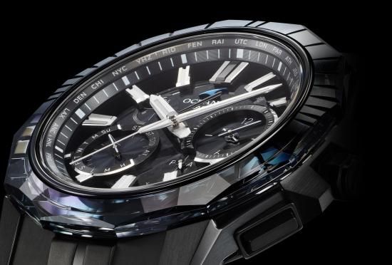 江戸切子の職人による手作業のカッティングラインのサファイアガラスベゼルが特徴です。