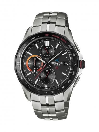 サファイアガラスベゼルのタキメーターには「OKUDA TAMIO」の文字と生誕60周年を祝い「60」の文字を赤色にした特別仕様。9時側のインダイアルリングは、自身の好きな色であるオレンジと赤のグラデーションデザインを採用しています。