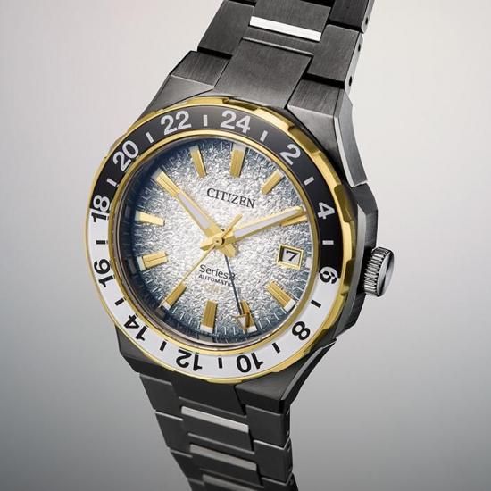 GMT機能付きムーブメントCal.9054を搭載。グレーめっきをベースに、アクセントカラーとしてホワイトとゴールドを使い、都市の灯りに照らされた雪の夜を表現しています。文字板は、ホワイトからブラックへのグラデーションで仕上げたオリジナルパターンを採用。アスファルトを覆う降り積もる雪が、都市の灯りに照らされている様子をイメージしています。ベゼル・インデックス・針に、夜の都市の灯りを想起させるゴールドをあしらい、特別感をきわだたせています。