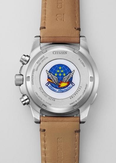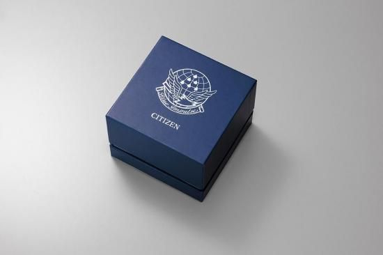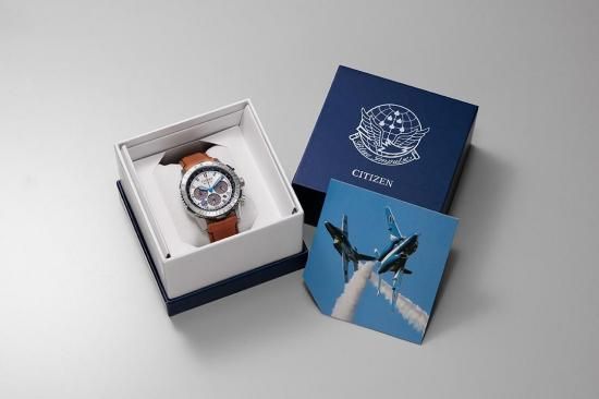 ケース径40mmのコンパクトなサイズで、腕が細い方にも違和感なくフィット。より多くのブルーインパルスファンの心をとらえる、使いやすい1本です。ブルーインパルスのチームカラーを想起させるブルーとシルバーの配色が、力強さと爽やかさを感じさせます。文字板と裏ぶたに、ブルーインパルスのエンブレムをレイアウト。専用ボックスの中には、ブルーインパルスの現行機種T-4の飛行シーンを印刷したカードが入っています。