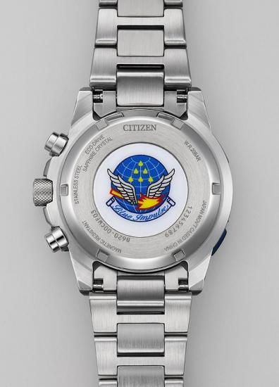 ケース径40mmのコンパクトなサイズで、腕が細い方にも違和感なくフィット。より多くのブルーインパルスファンの心をとらえる、使いやすい1本です。ブルーインパルスのチームカラーを想起させるブルーとシルバーの配色が、力強さと爽やかさを感じさせます。文字板と裏ぶたに、ブルーインパルスのエンブレムをレイアウト。専用ボックスの中には、ブルーインパルスの現行機種T-4の飛行シーンを印刷したカードが入っています。